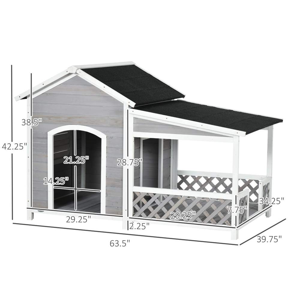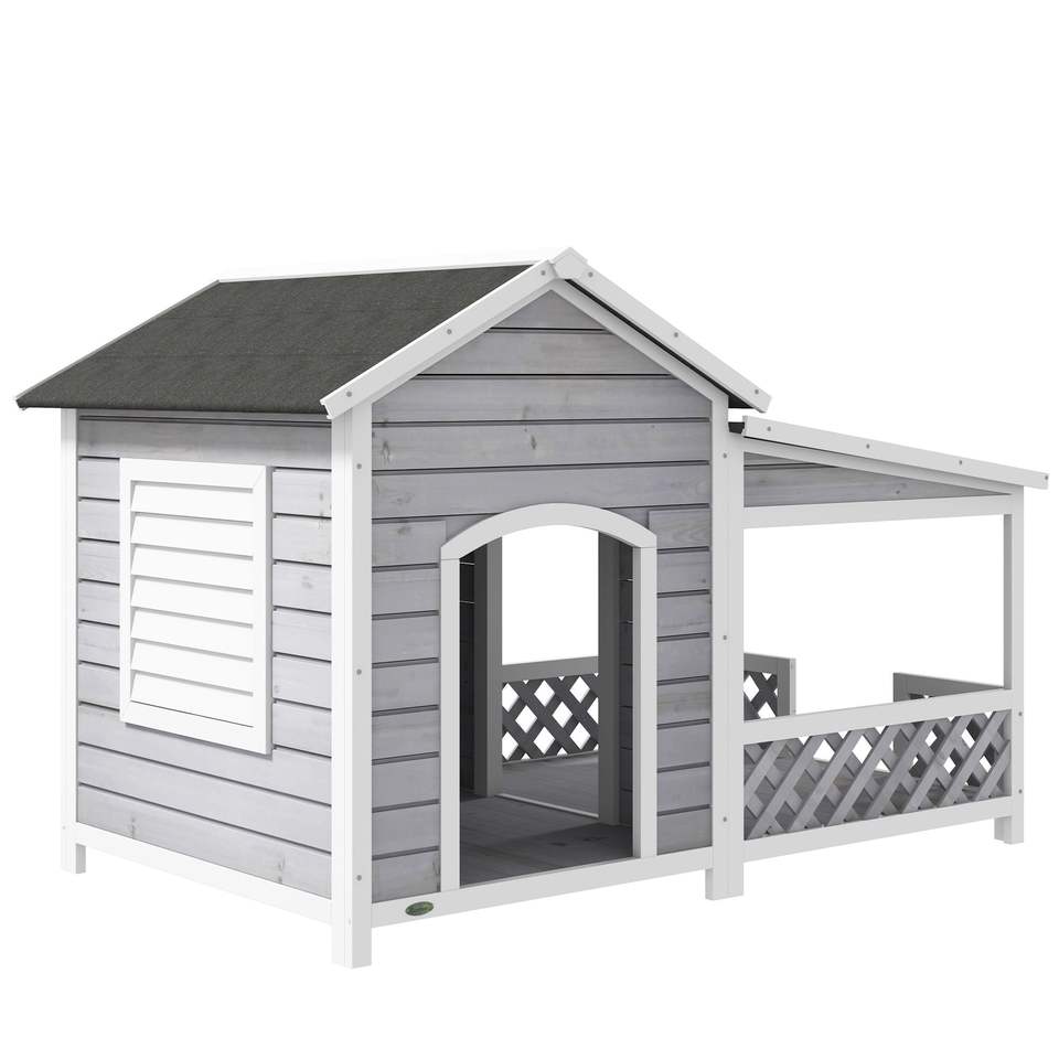 Casa di cabina per cani all'aperto di medie o grandi dimensioni con il portico asfalto tetto porte e finestra con otturatore perfetto per animali domestici