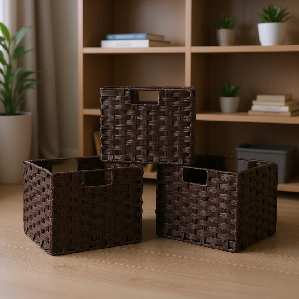 Set di 3 Cesti in Fibra Intrecciata Melanie, Organizzatori Pieghevoli Rettangolari Color Cioccolato per Soggiorno