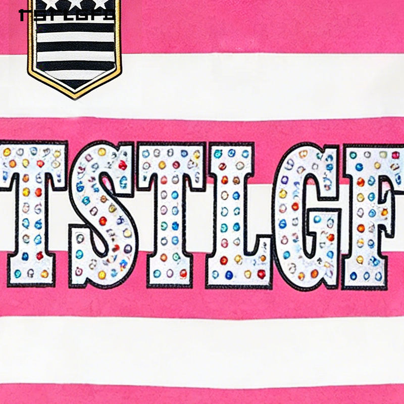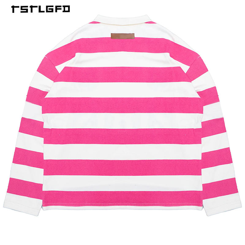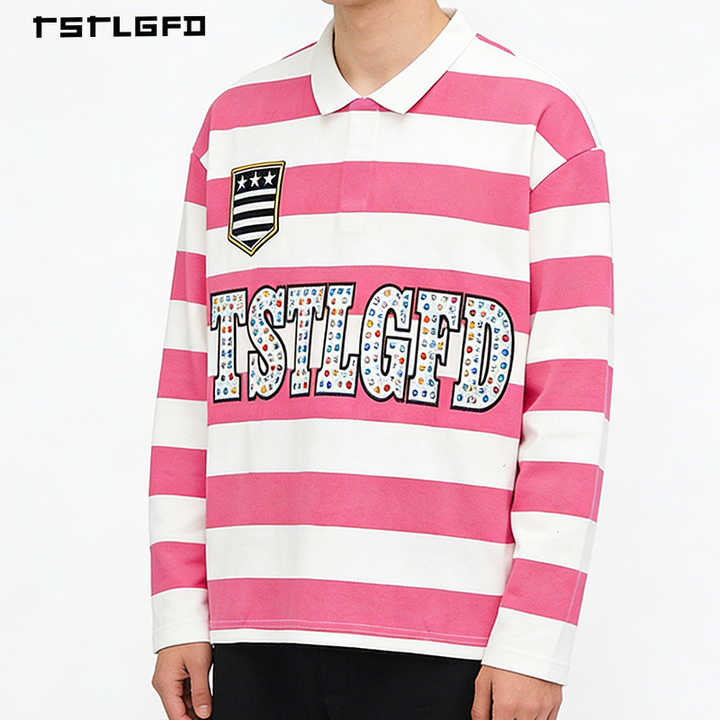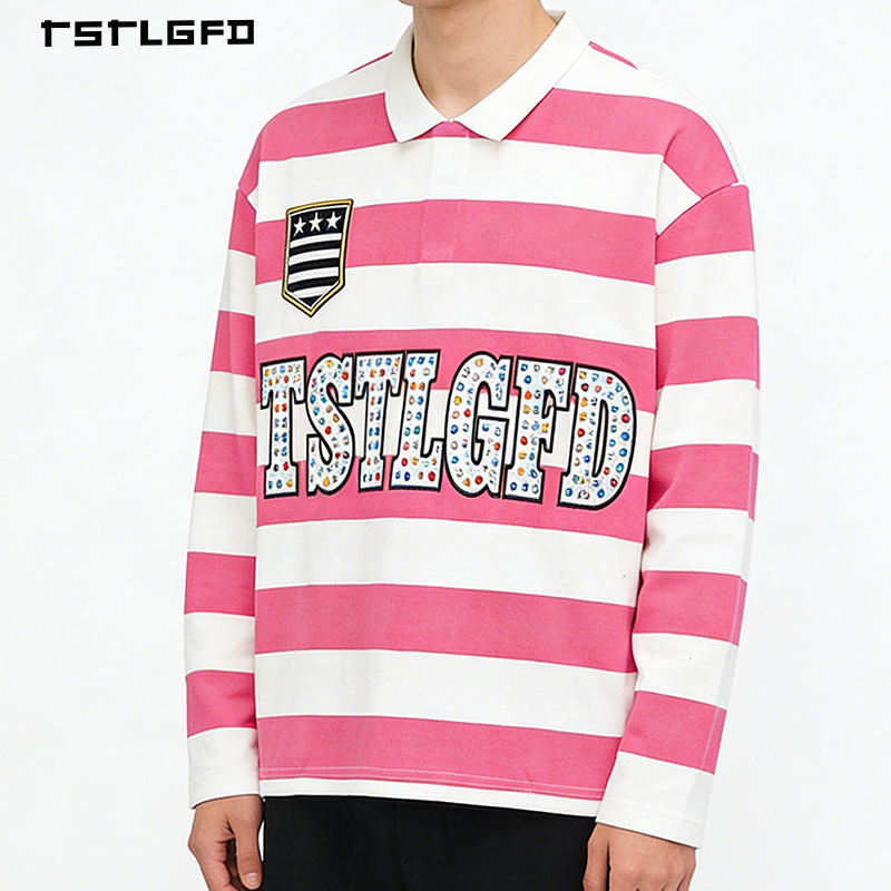 T-shirt da uomo ricamata con strass, a maniche lunghe, a righe, stile polo, vestibilità ampia, streetwear