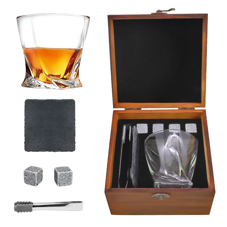 Scatola di legno, tazza di vetro, pietra di whisky, pinze in acciaio inox, sottobicchiere