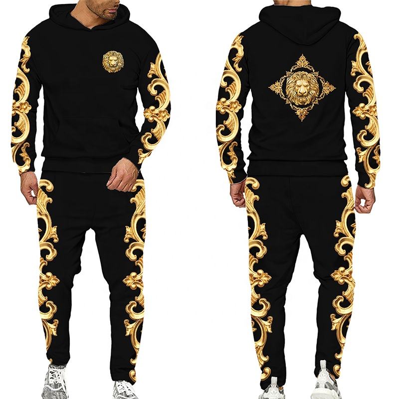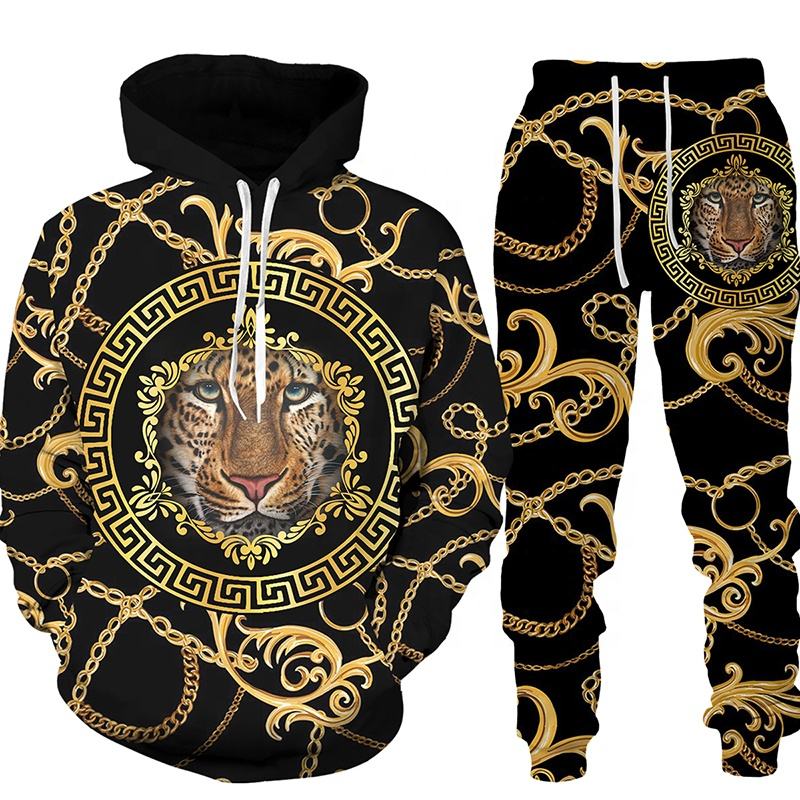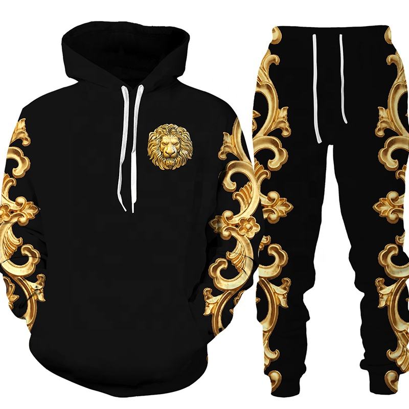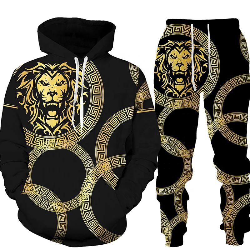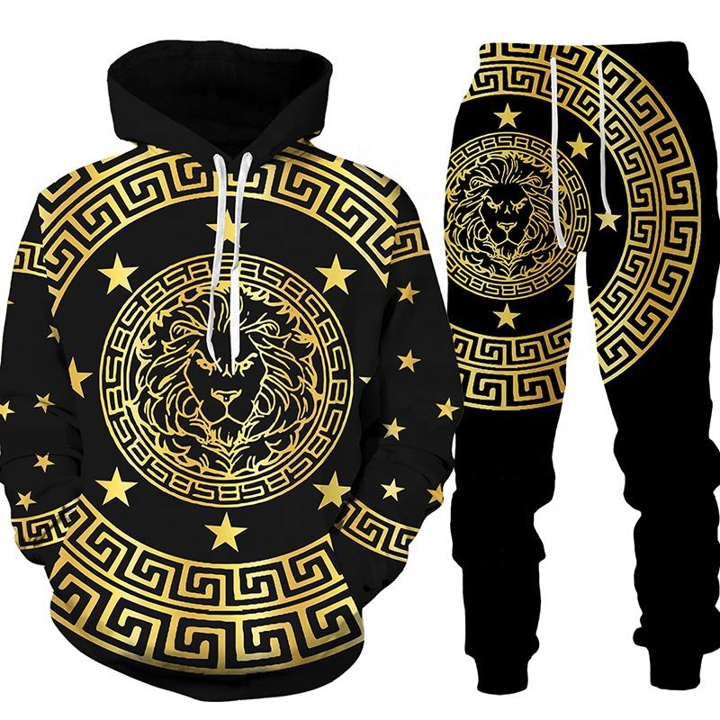 Uomo donna modello dorato testa di leone stampato felpa con cappuccio/pantaloni/tuta grafica Oversize felpa con cappuccio pantaloni tuta abbigliamento uomo Chandal