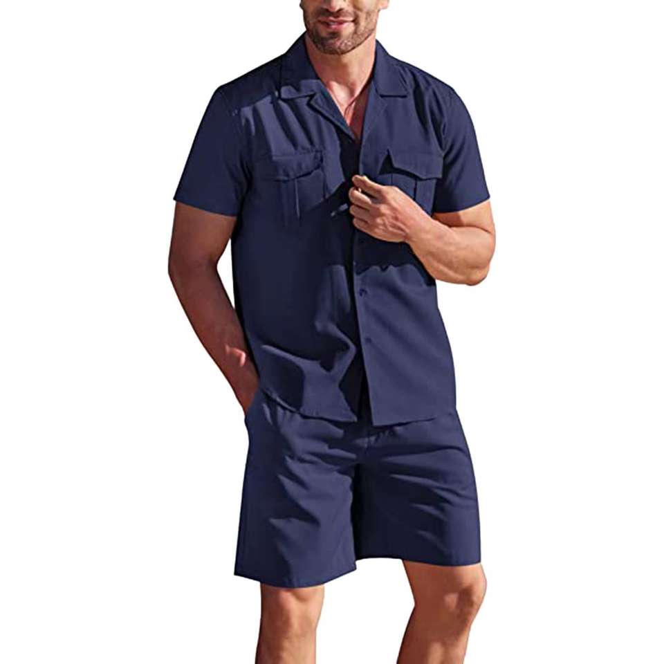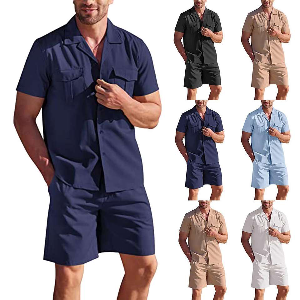 Set da uomo in lino 2 pezzi camicia estiva con bottone a maniche corte da spiaggia