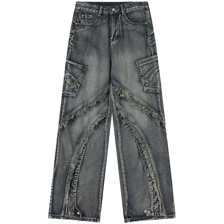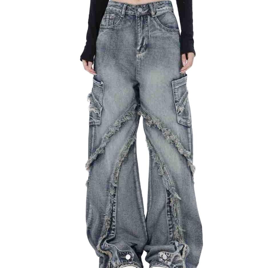 Jeans Casual stile retrò americano Casual a gamba larga in maglia Denim con ampie tasche sfrangiate con bordi consumati motivo lavato per l'autunno