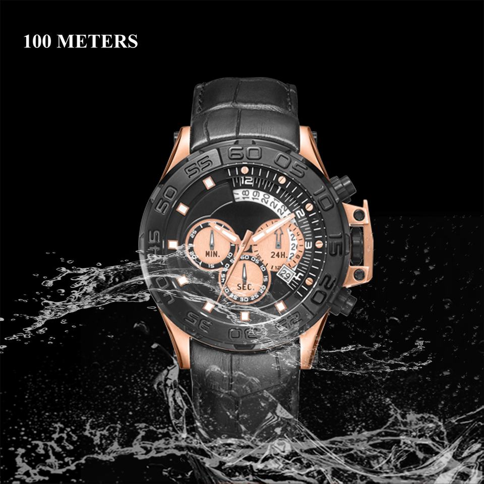 Orologio Cronografo da Uomo con Movimento Giapponese, Quadrante 24 Ore, 3 Lancette, Cassa in Acciaio Inossidabile Nero, Cinturino in Pelle, Impermeabile, Luminoso, OEM