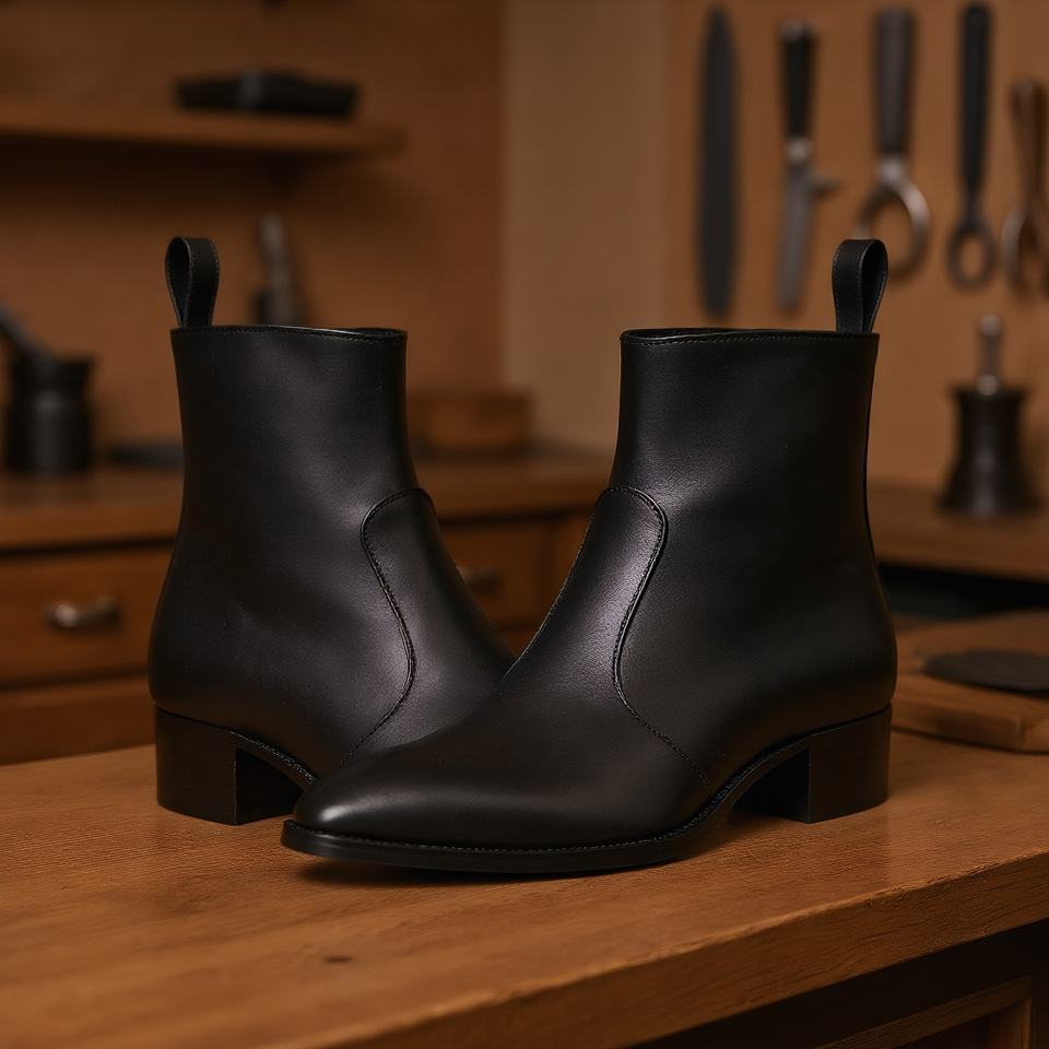 Men's Classic Luxury Chelsea Boots Black Leather Slip-On Pointed Toe Chunky Heel Height Increasing Ankle Boots Rubber Outsole