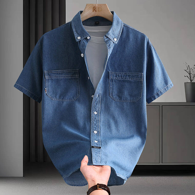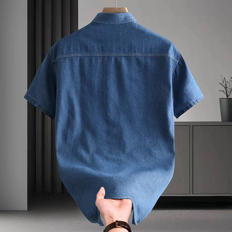 Camicie in denim da uomo 2026 Primavera Estate a maniche corte con colletto quadrato monopetto con perline lavabili in lavatrice casual tinta unita