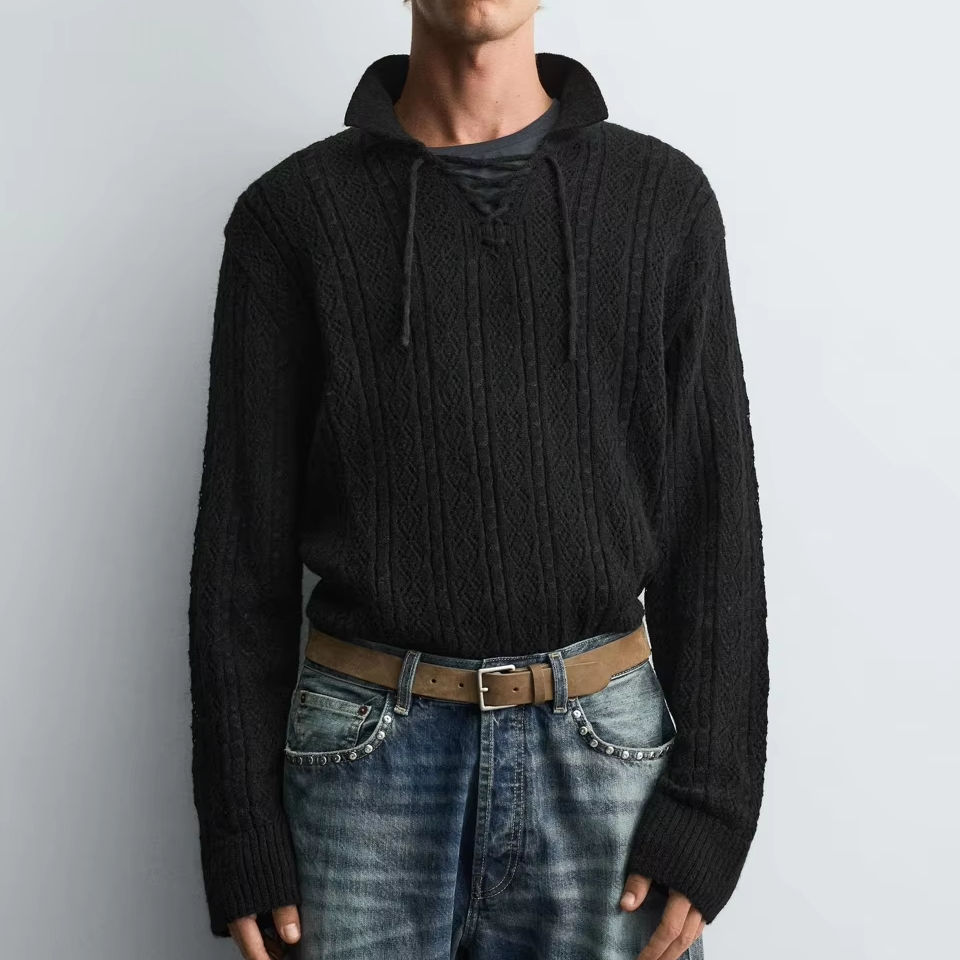 Maglione Polo da Uomo di Design in Pizzo Nero a Maniche Lunghe, Pullover Traforato Trasparente con Colletto Smerlato per un Look Avanguardista