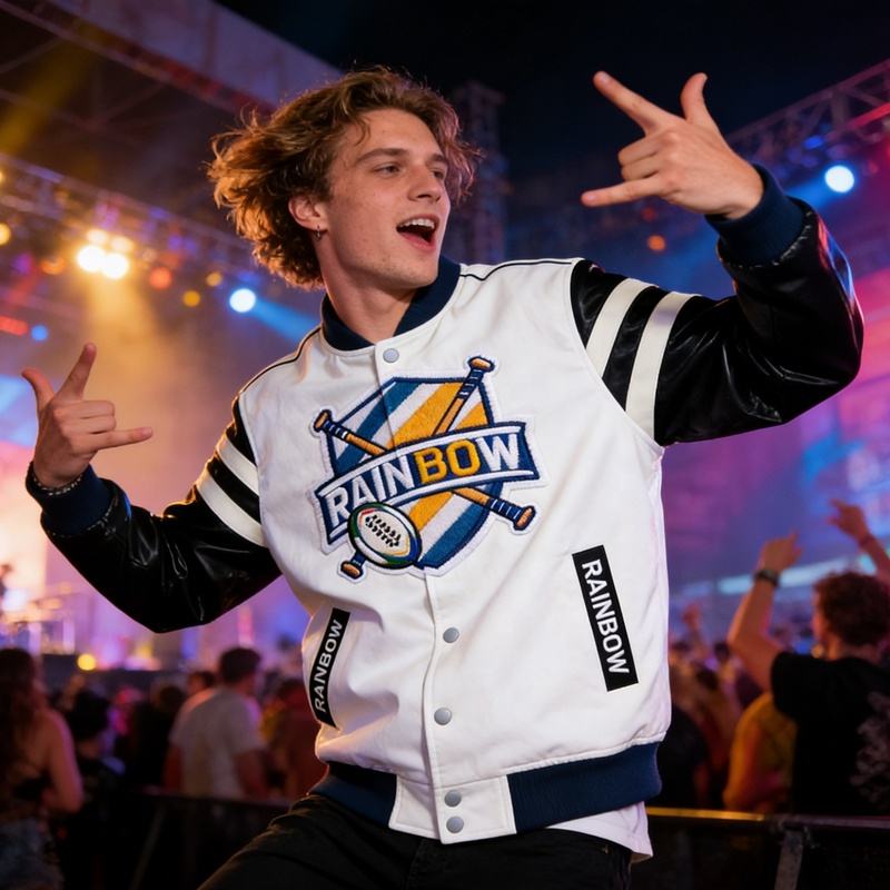 Giacca da Uomo con Ricamo, Patch Audace con Motivo Pipistrello e Palla, Dettagli in Pelle sulle Maniche, Stile Streetwear