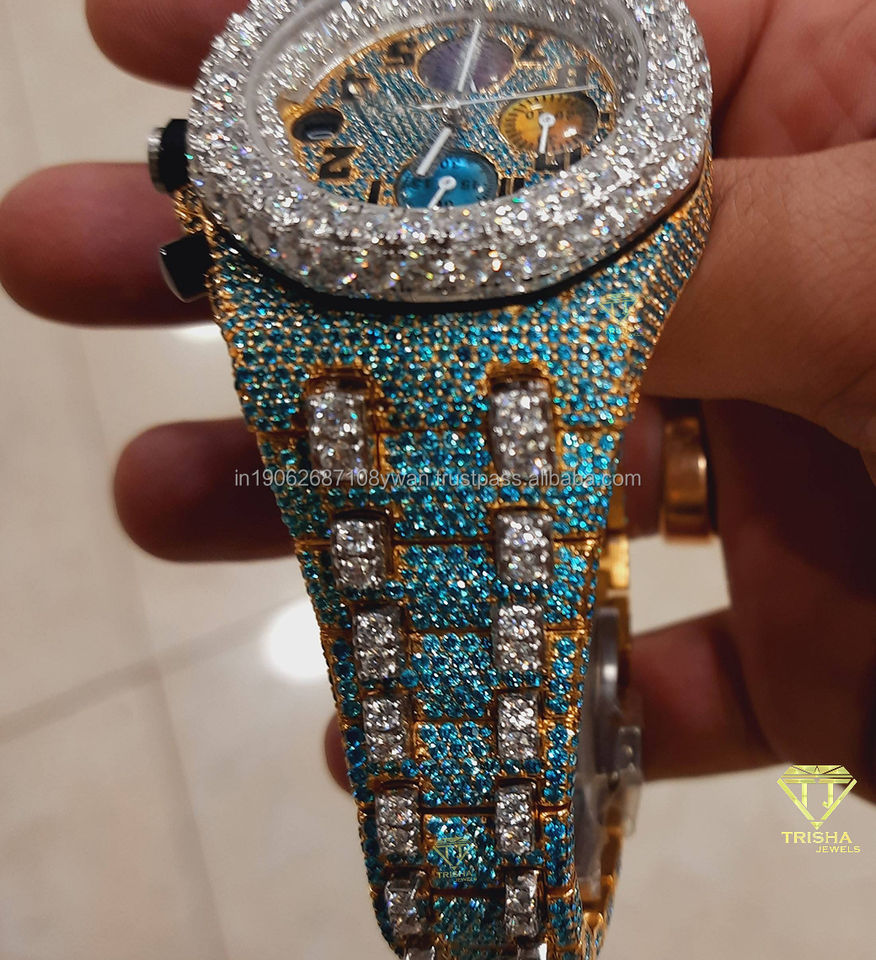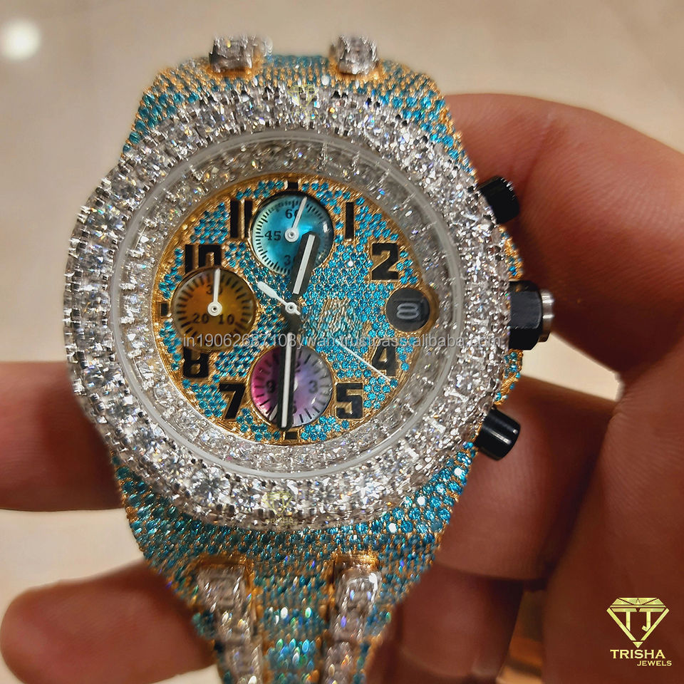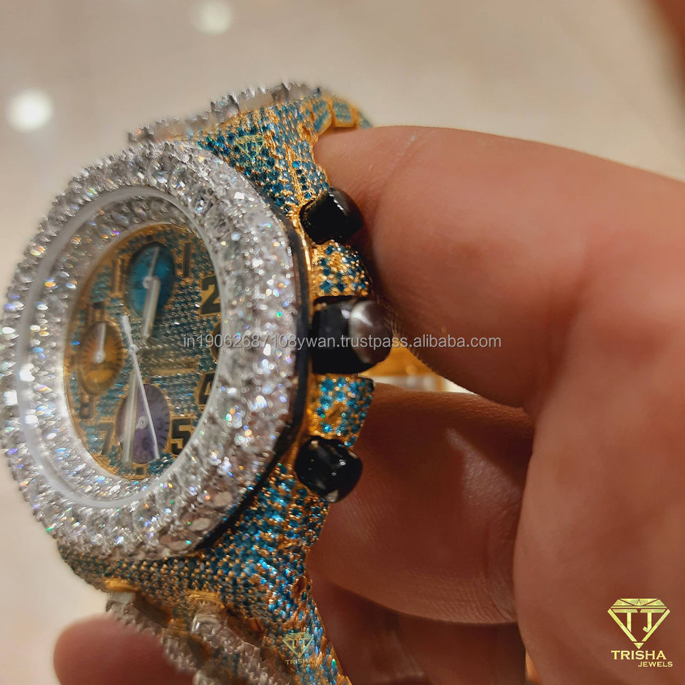 Da uomo squisito orologio meccanico completamente ghiacciato con quadrante giallo Moissanite diamante e movimento al quarzo di lusso in acciaio inossidabile