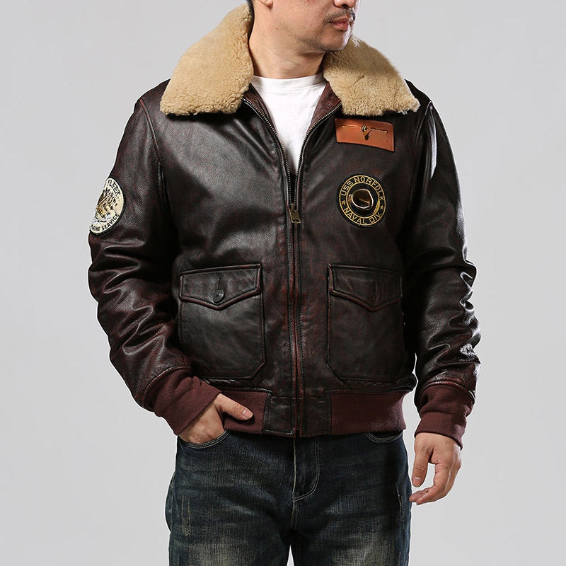 Giacca da Pilota da Uomo in Vera Pelle con Colletto Staccabile in Lana di Cotone Giacca di Volo in Pelle Bovina Gialla