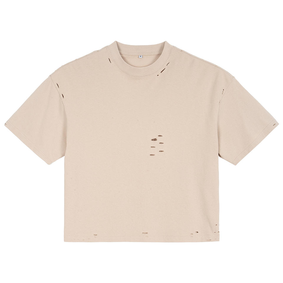 T-shirt uomo heavy-weight cropped-oversize, cotone lavato vintage, boxy distressed, taglie S–XXL, personalizzabile, MOQ 1