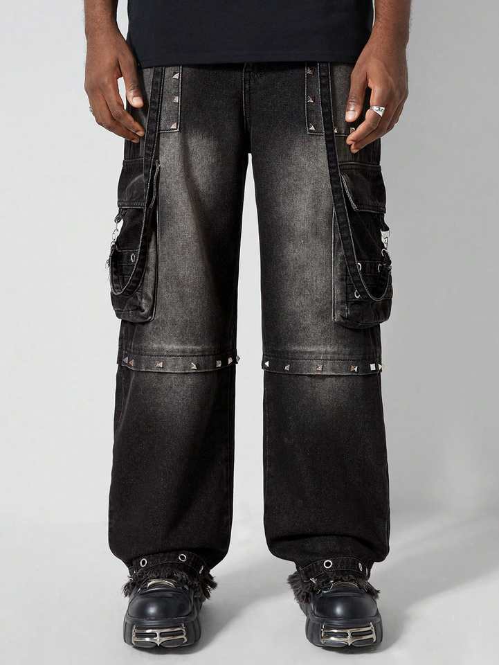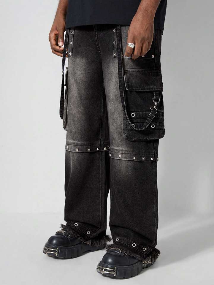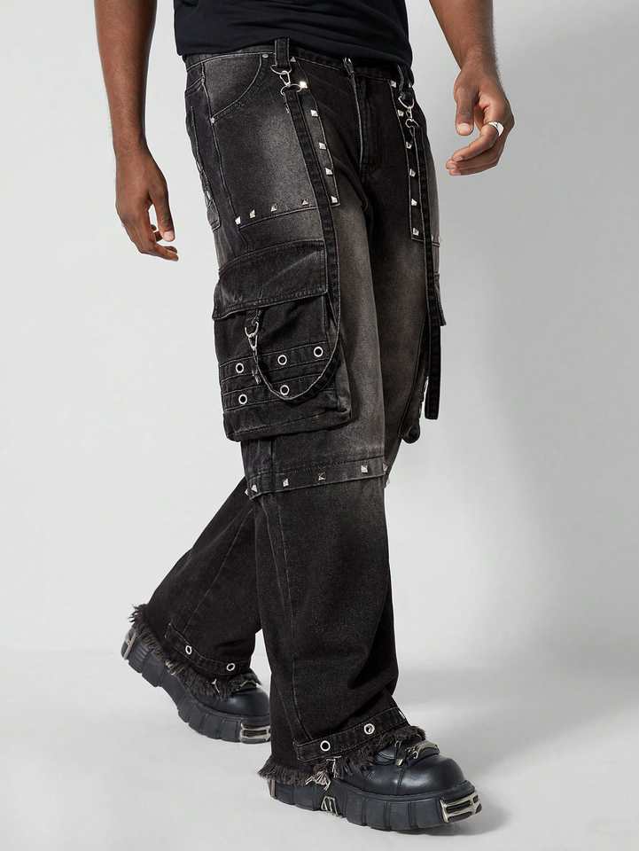 Men's High Quality Jeans Trousers Straight Leg Loose Fitting Multi Pocket Design Black Gray Washed Chain Nail Bead Men's Jeans