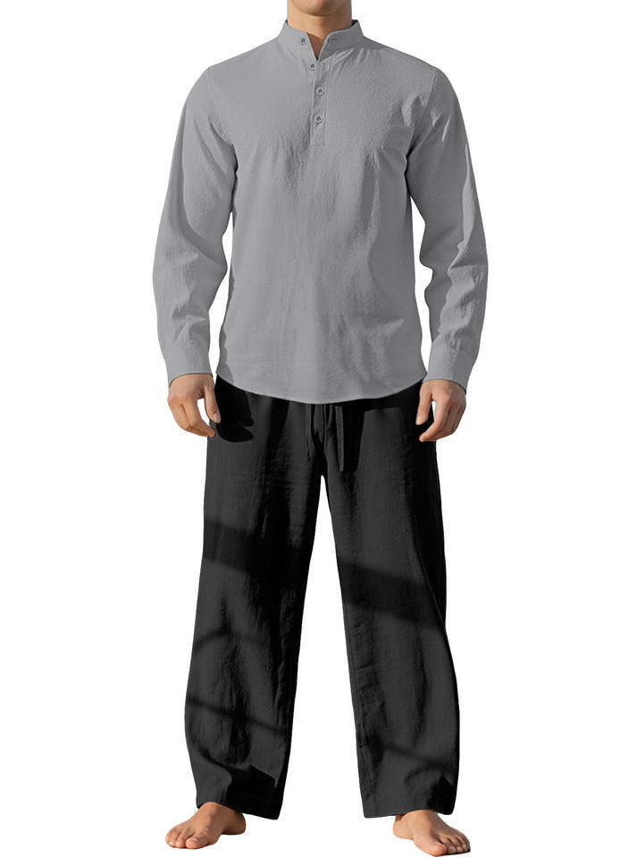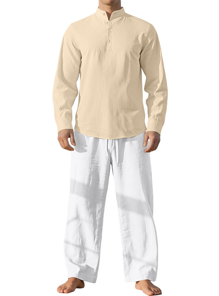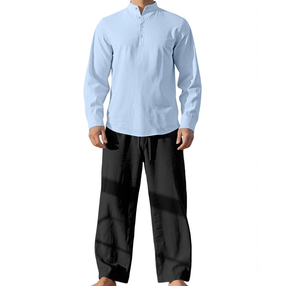 Completo Casual da Uomo in Lino a Due Pezzi, Motivo Tinta Unita, Camicia a Maniche Lunghe Larga e Traspirante con Pantaloni, Perfetto Outfit Autunnale da Spiaggia