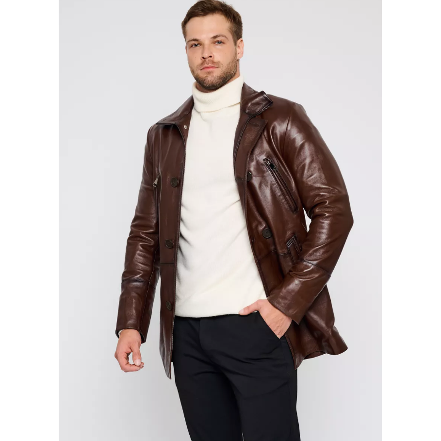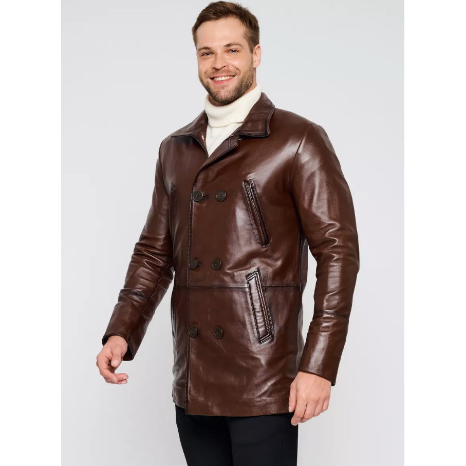 Cappotto in pelle di agnello doppiopetto da uomo – Marrone castagna, Vestibilità su misura, Finitura premium