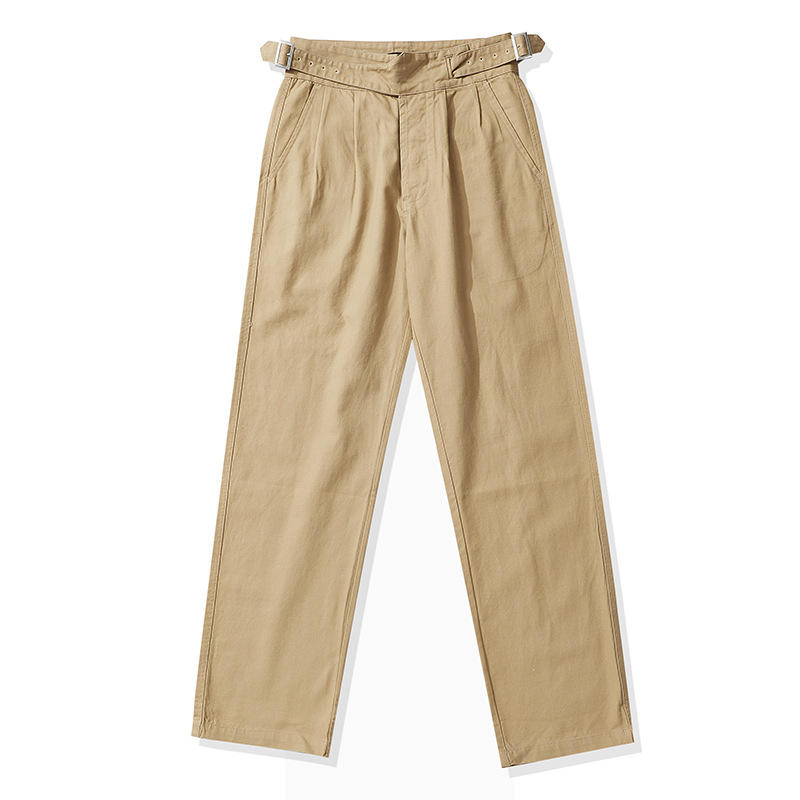 Men's Loose Casual Cotton Pants Cargo Trousers With Adjustable Gurkha Waist and Khaki Color Straight Pattern Fabric
