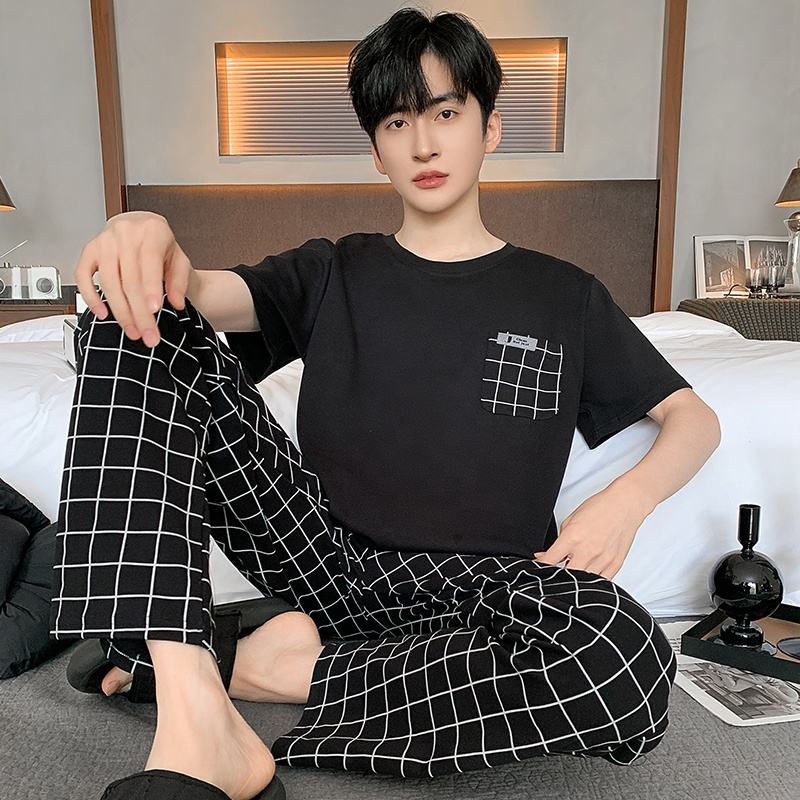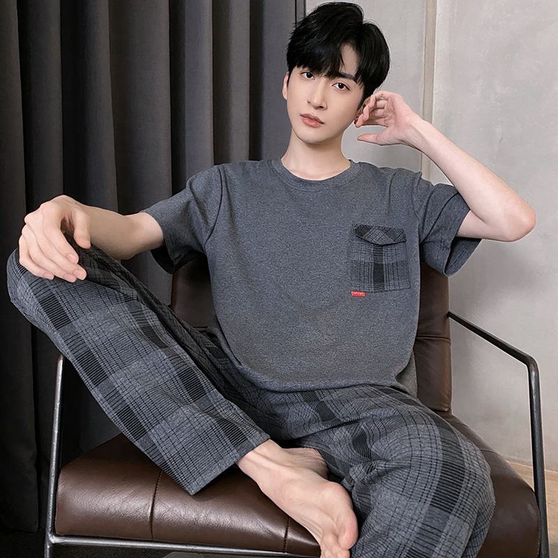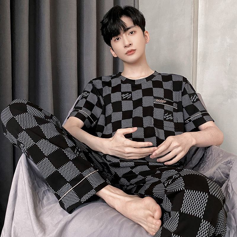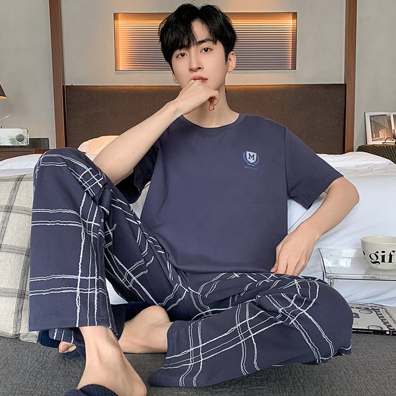 Men's Pajamas Short Sleeve Long Pants 2 Pieces Set Men Sleepwear O-neck Leisure Style Cotton Soft 4XL Plus Size Night Wear