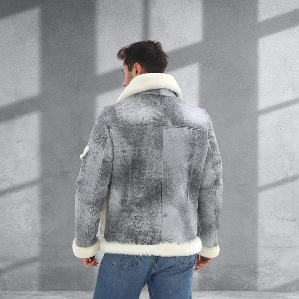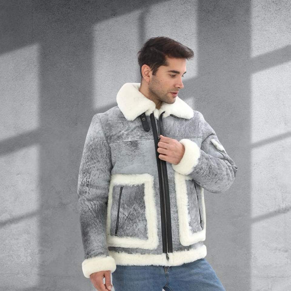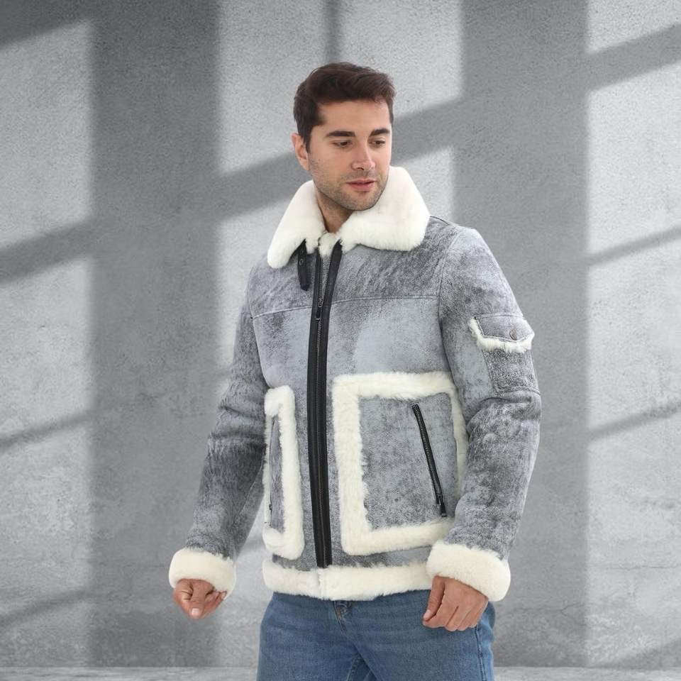 Giacca in shearling da uomo – Pelle grigio argento, chiusura con zip, fodera in lana naturale