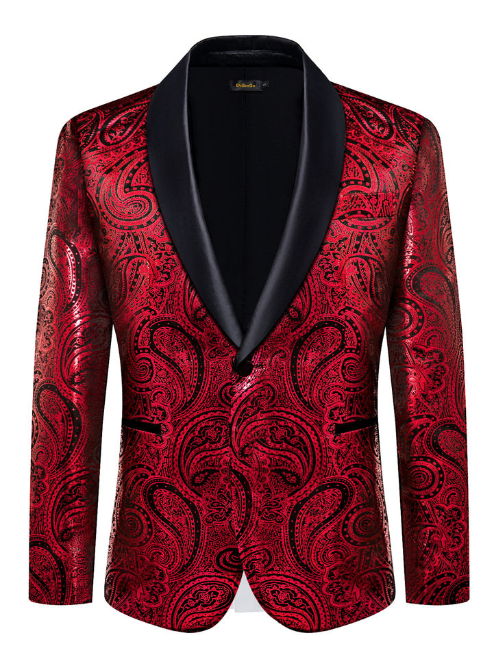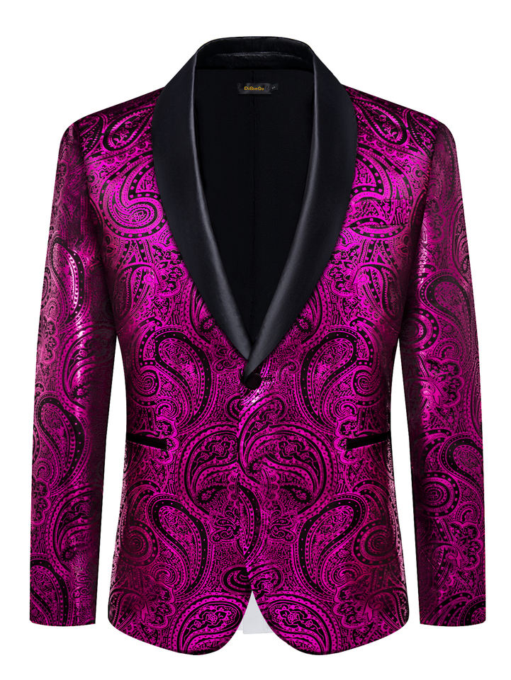 Giacca da uomo monopetto con motivo Paisley rosso, verde, rosa e nero, decorata con perline, per feste, con risvolto