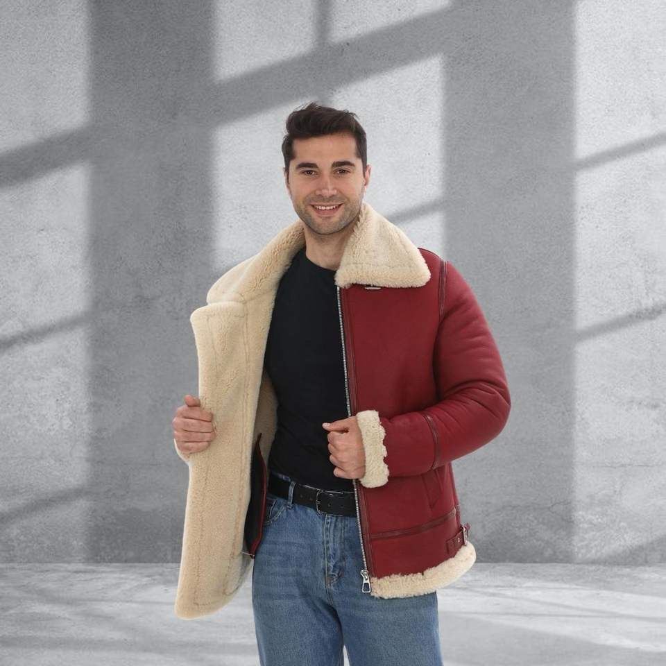 Giacca aviator in shearling rossa da uomo – Abbigliamento invernale in vera pelle di pecora, Fatto a mano OEM/Wholesale Su misur