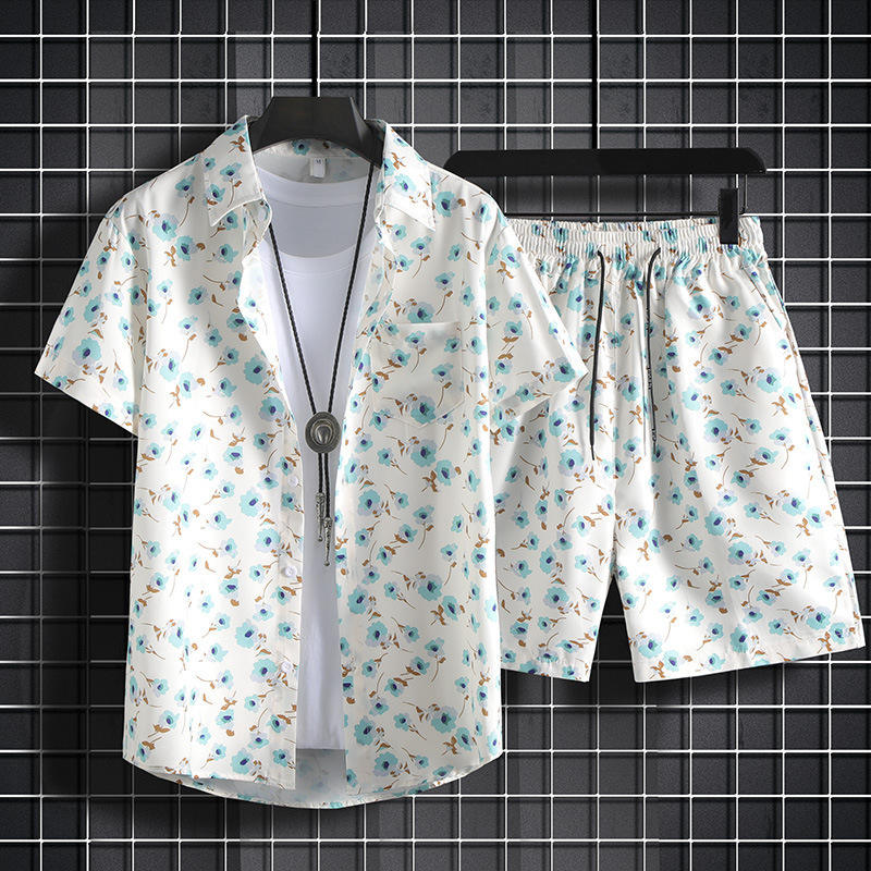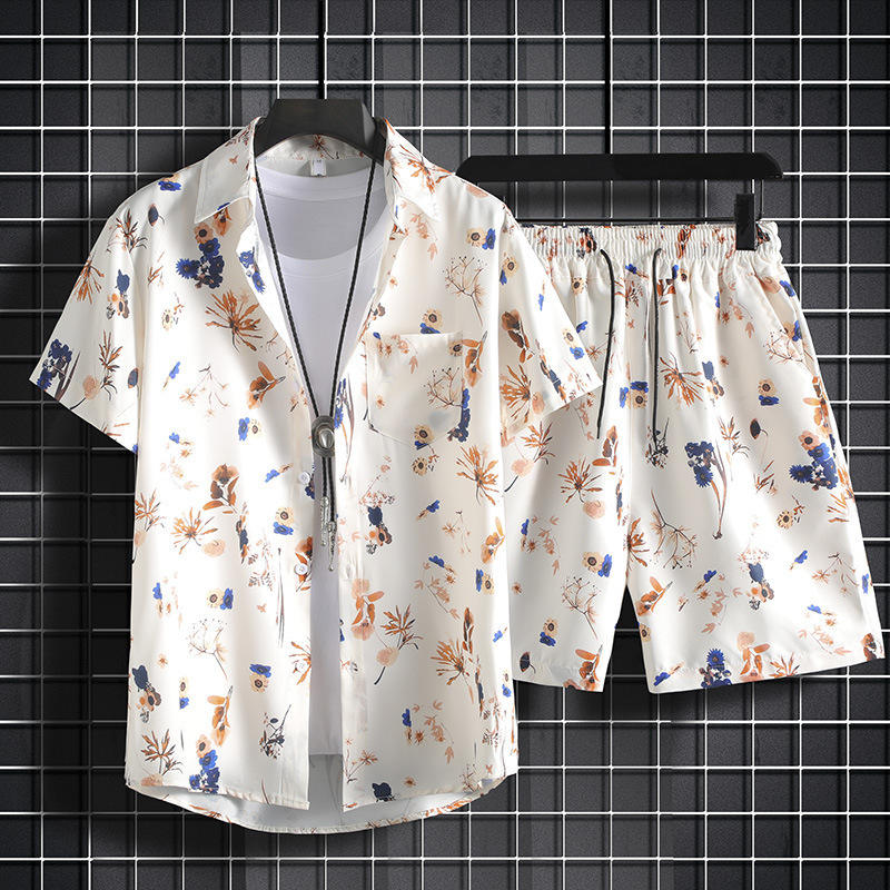 Men's Retro Hong Kong-Style Hawaiian Beach Shirt Short-Sleeved and Loose Fit Casual Summer Clothing in Large Size Shorts