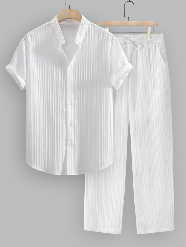 Men's Simple Casual Business Shirt and Casual Pants Two-piece Set Solid Color Stand-up Collar Short-sleeved Trousers Suit