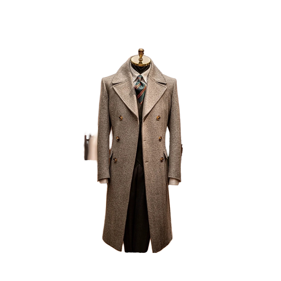 YY030-1 Cappotto uomo slim doppiopetto 50% lana/50% poliestere a spina di pesce, lungo primavera/autunno, bottone singolo