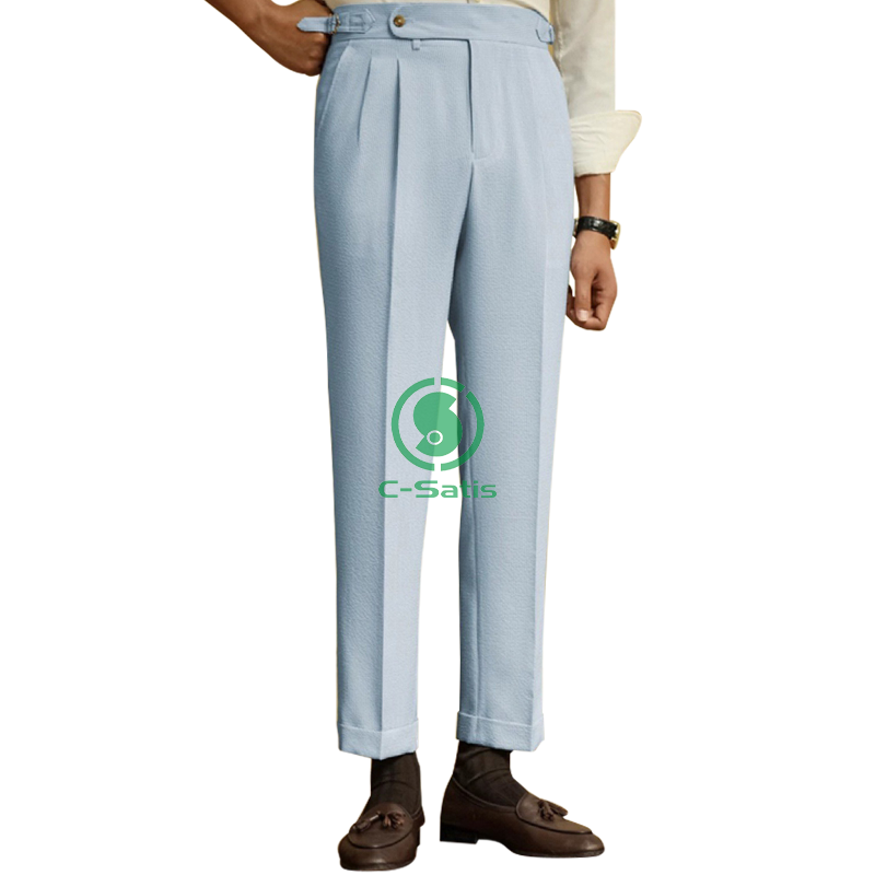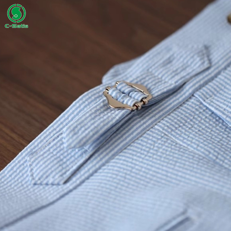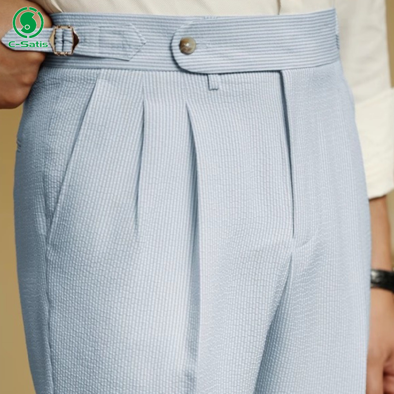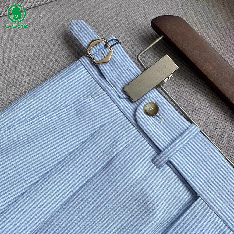 Men's Summer Lightweight Seersucker with Buckles Naples Blue Striped High Waist Trousers Straight Pattern Casual Pants Mens
