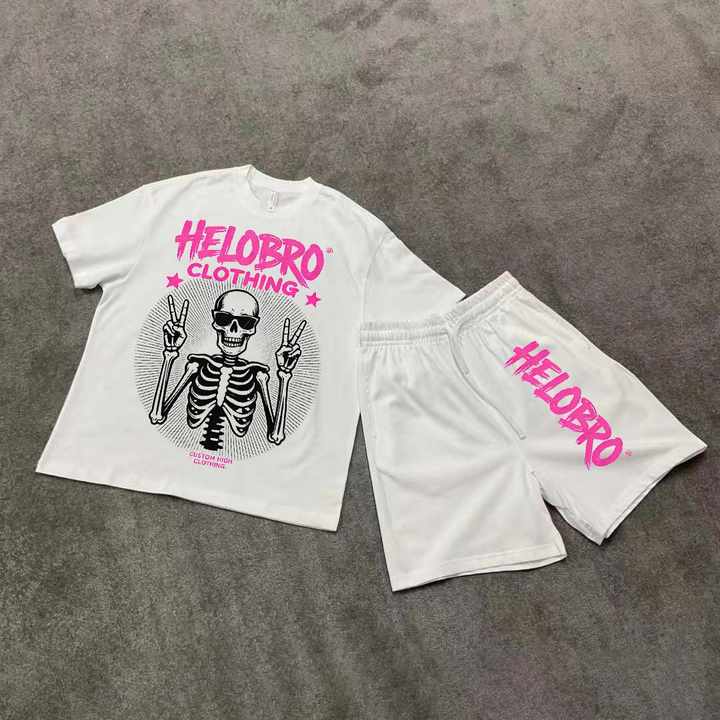 Men's Summer Thermal Knitted White Oversized T-Shirt & Shorts Set Hot Pink Skeleton Peace Sign Print Casual Streetwear Tracksuit