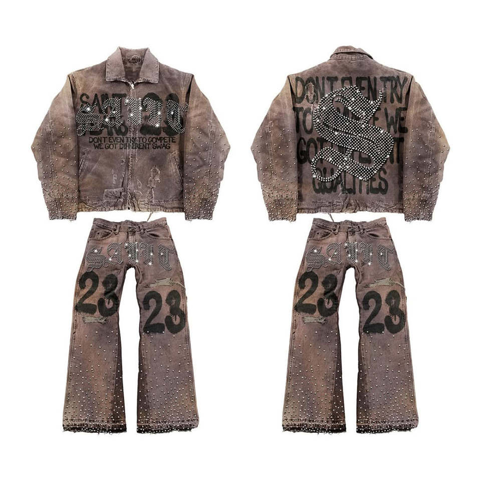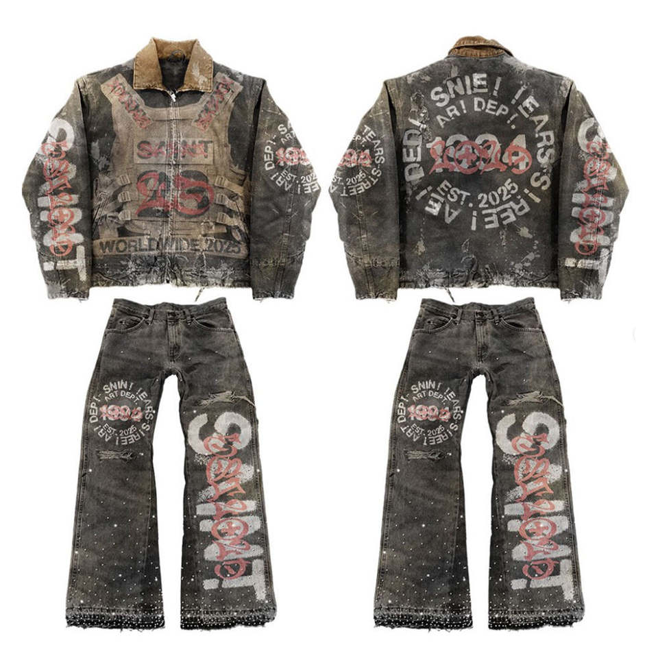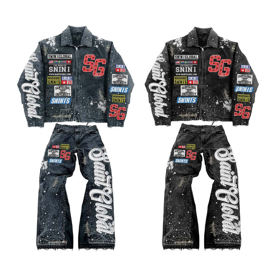Set Giacca e Jeans Vintage da Uomo, Design con Ricami e Patchwork, Outfit Streetwear Retrò, Personalizzabile, Direttamente dalla Fabbrica