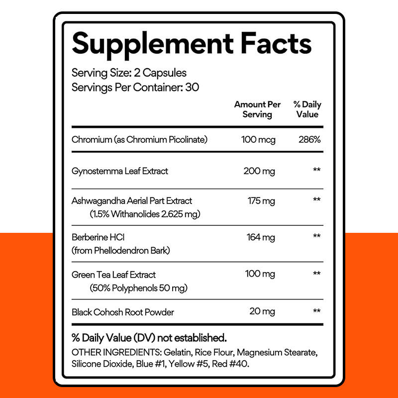 Ingrediente principale:Cromo, Estratto di foglie di Gynostemma, Estratto di parte aerea Ashwagandha, Berberina HCl, Estratto di foglie di tè verde, Radice di Cohosh nero in polvere