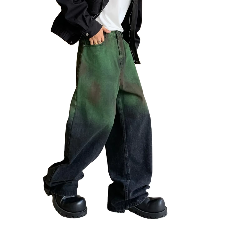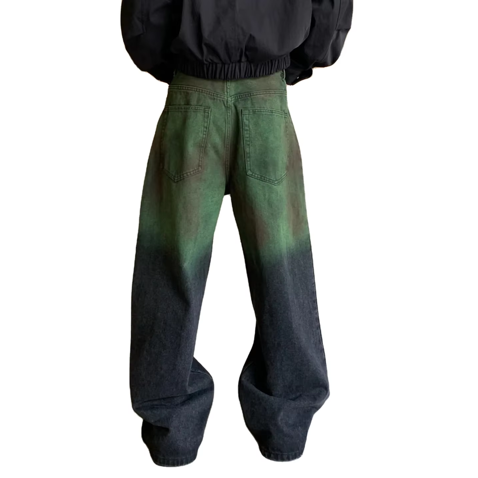 Mens Fashion Streetwear Designer Denim Aurora Green and Black Color-Block Relaxed Fit Baggy Jeans