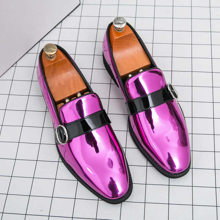 Mocassini da Uomo di Lusso in Pelle Verniciata Metallizzata Magenta Lucida con Cinturino a Fibbia per Matrimoni, Feste e Balli di Gala