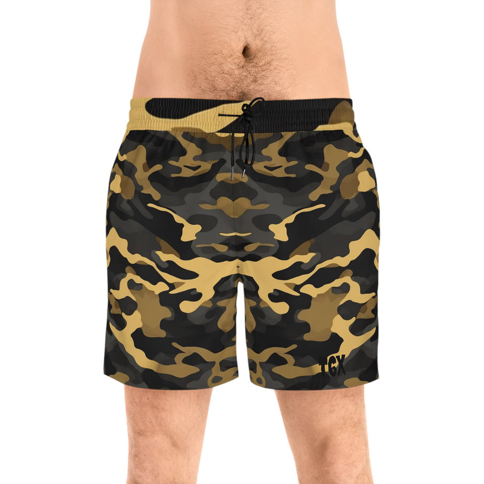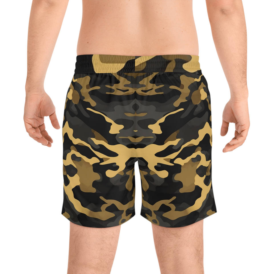 Mens Mid-Length Swim Shorts Black and Gold Camo