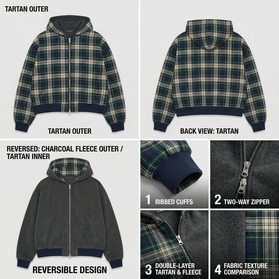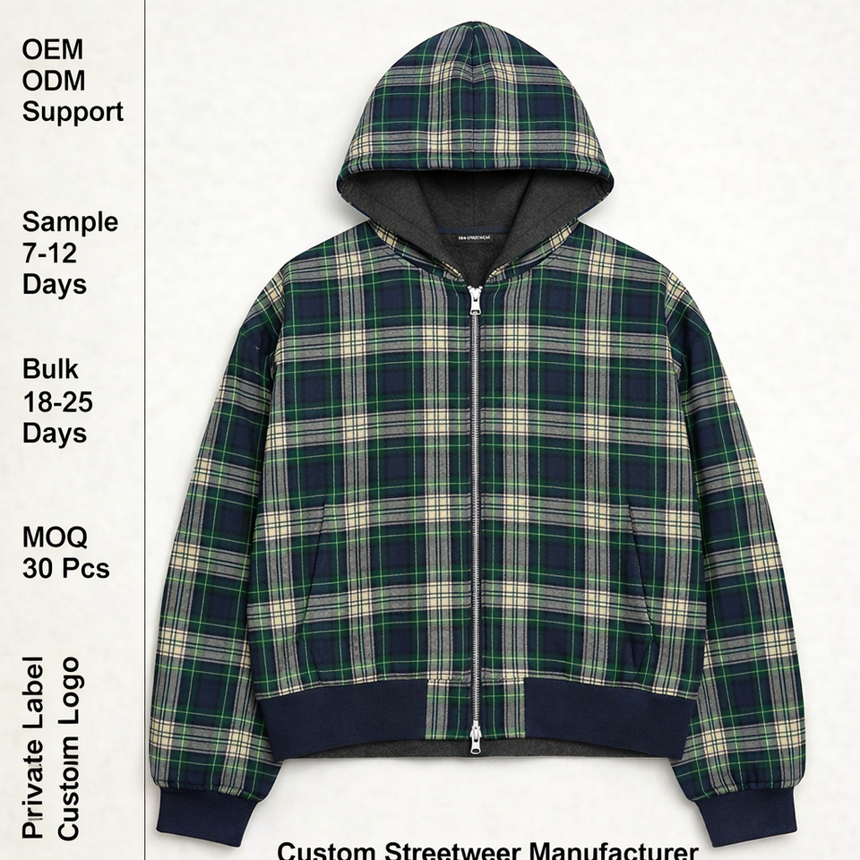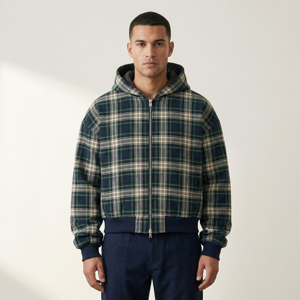 Felpa con cappuccio da uomo oversize in cotone felpato pesante 480 g/m² con stampa tartan, maniche a palloncino e zip, personalizzabile con logo