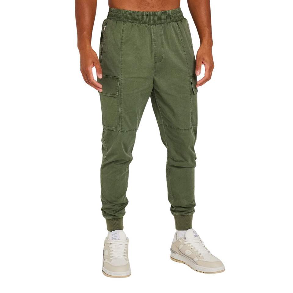 Mens Tapered Fit Dark Khaki Utility Cargo Pants with Rugged Washed Finish, Metal Closures, and Functional Side Pockets
