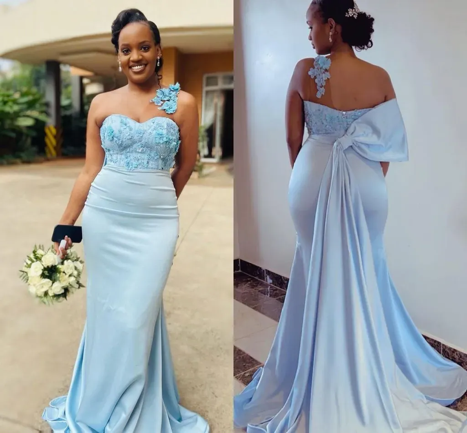 Mermaid Wedding One Shoulder Lace Applique Satin Bow Ruched Plus Size Maid of Honor Sky Blue Bridesmaid Dress MB395