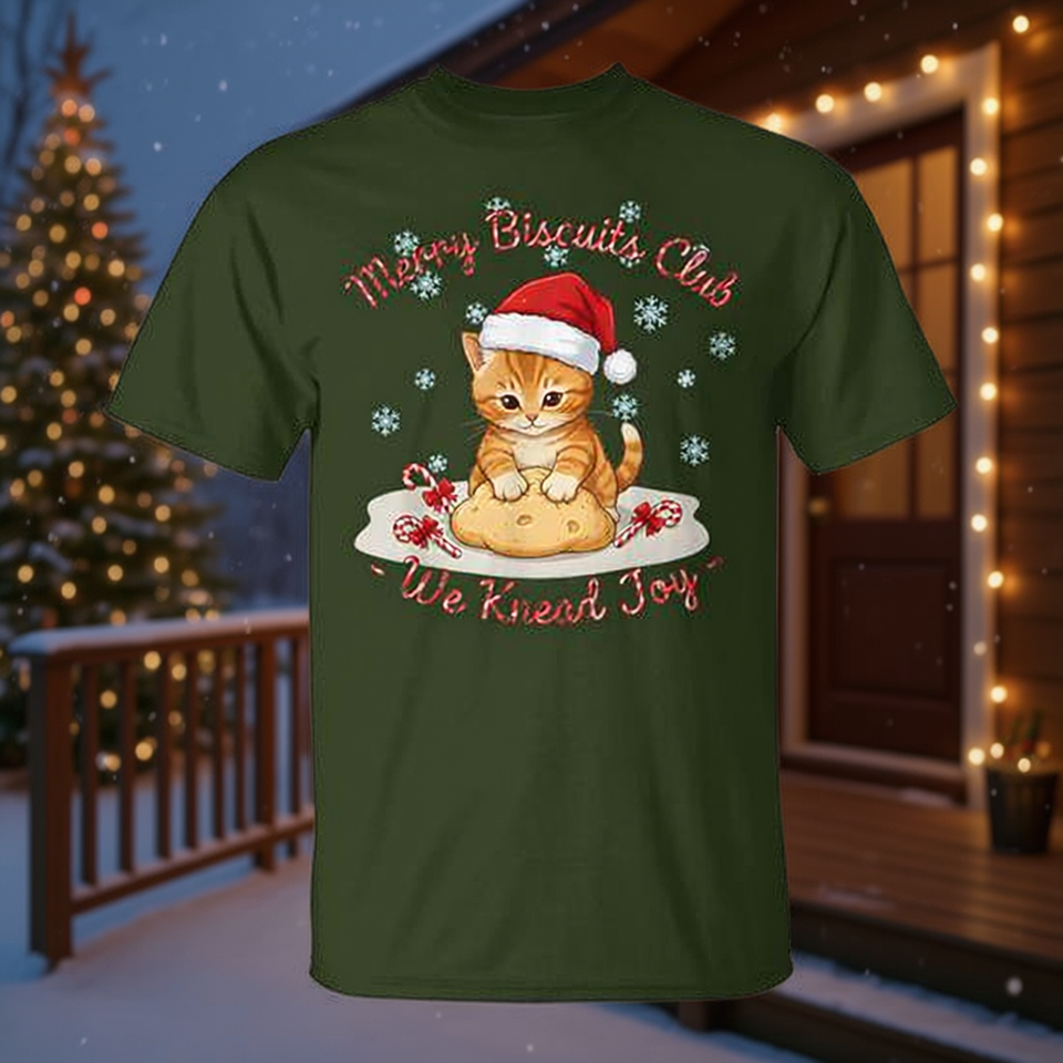 T-shirt natalizia Merry Biscuits Club Cat con design We Knead Joy Holiday