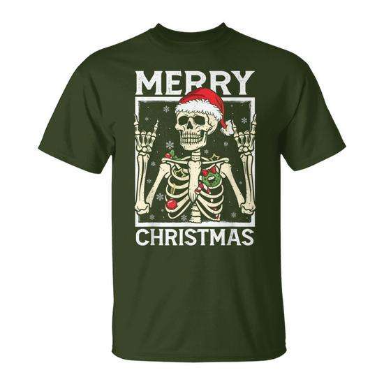 Maglietta Natalizia con Teschio e Scheletro, Design Festivo Unisex per Adulti, Collo Tondo, Manica Corta, Stampa Serigrafica