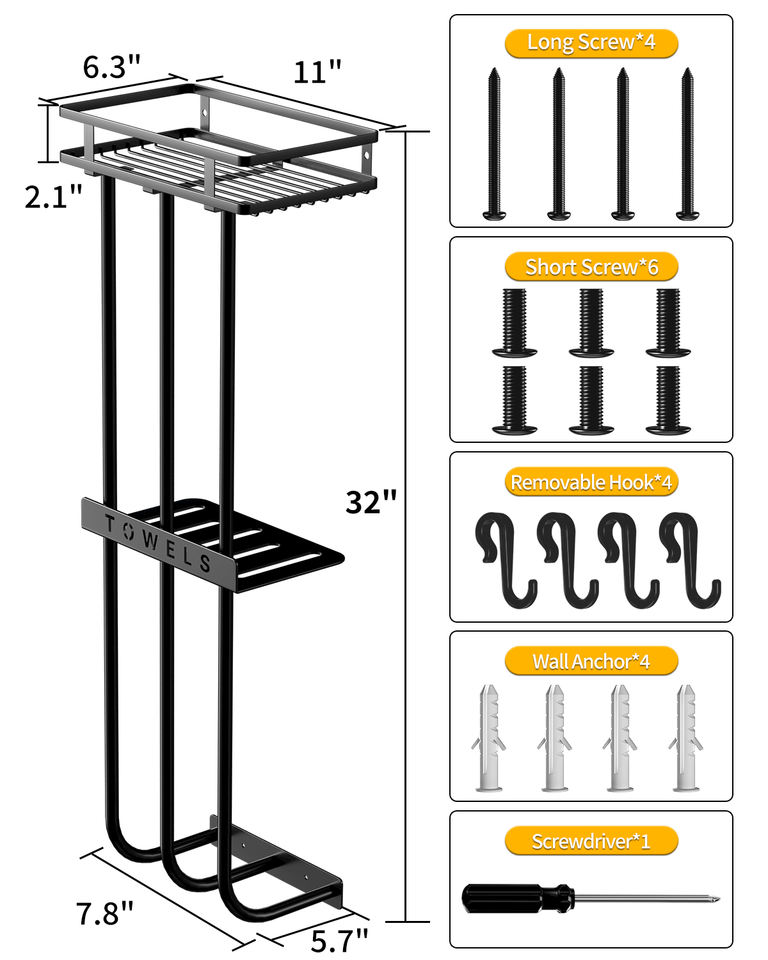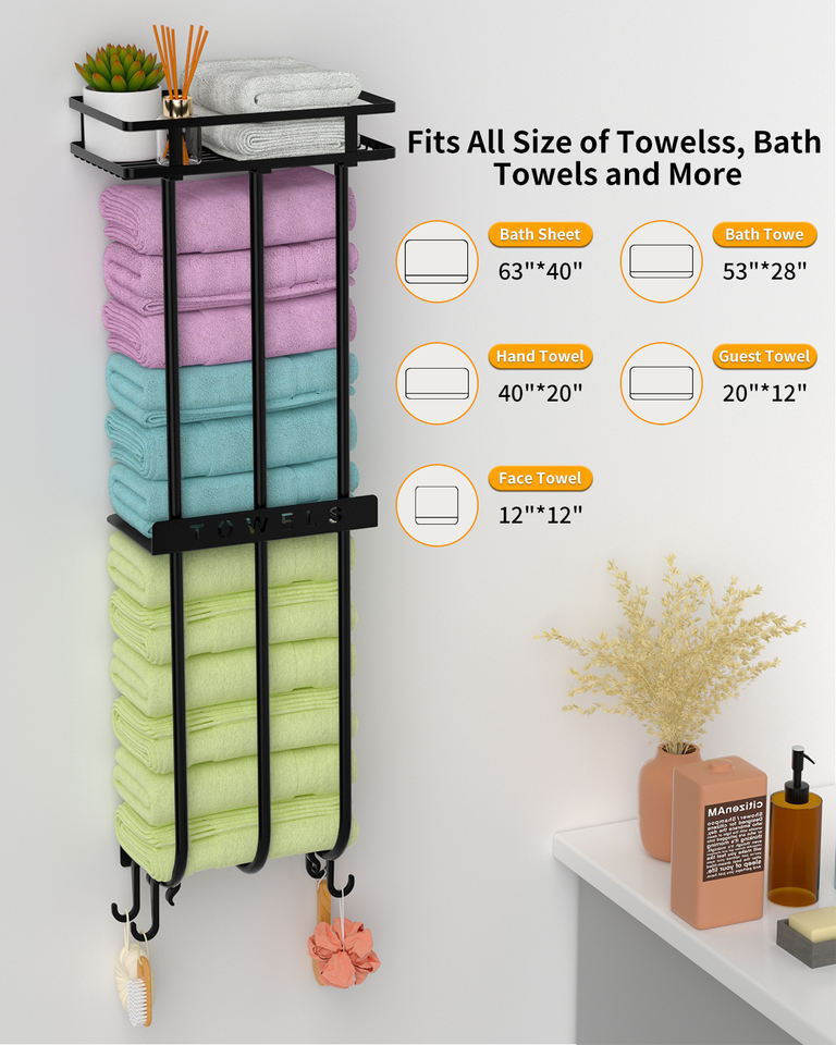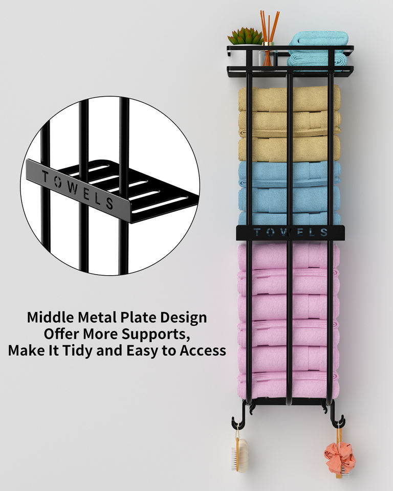 Porta Asciugamani in Metallo con Mensola in Legno e 4 Ganci per Piccoli Bagni, Porta Asciugamani da Parete per Bagno