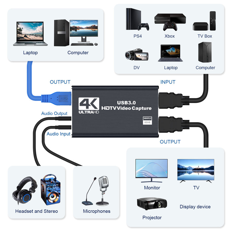 Metal USB 3.0 4K Gaming HDTV Capture Card Live Streaming Video Equipment with Cable for Laptop
