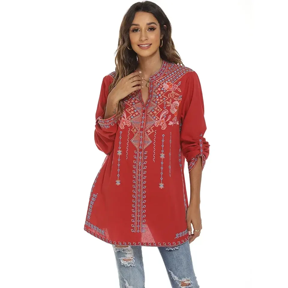 Camicette con Ricami Floreali Messicani, Camicia a Maniche Lunghe Autunnale