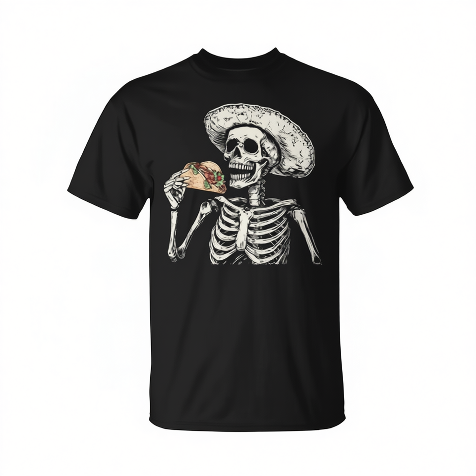 T-shirt per amanti dei taco con scheletro messicano, design unisex per adulti, nera