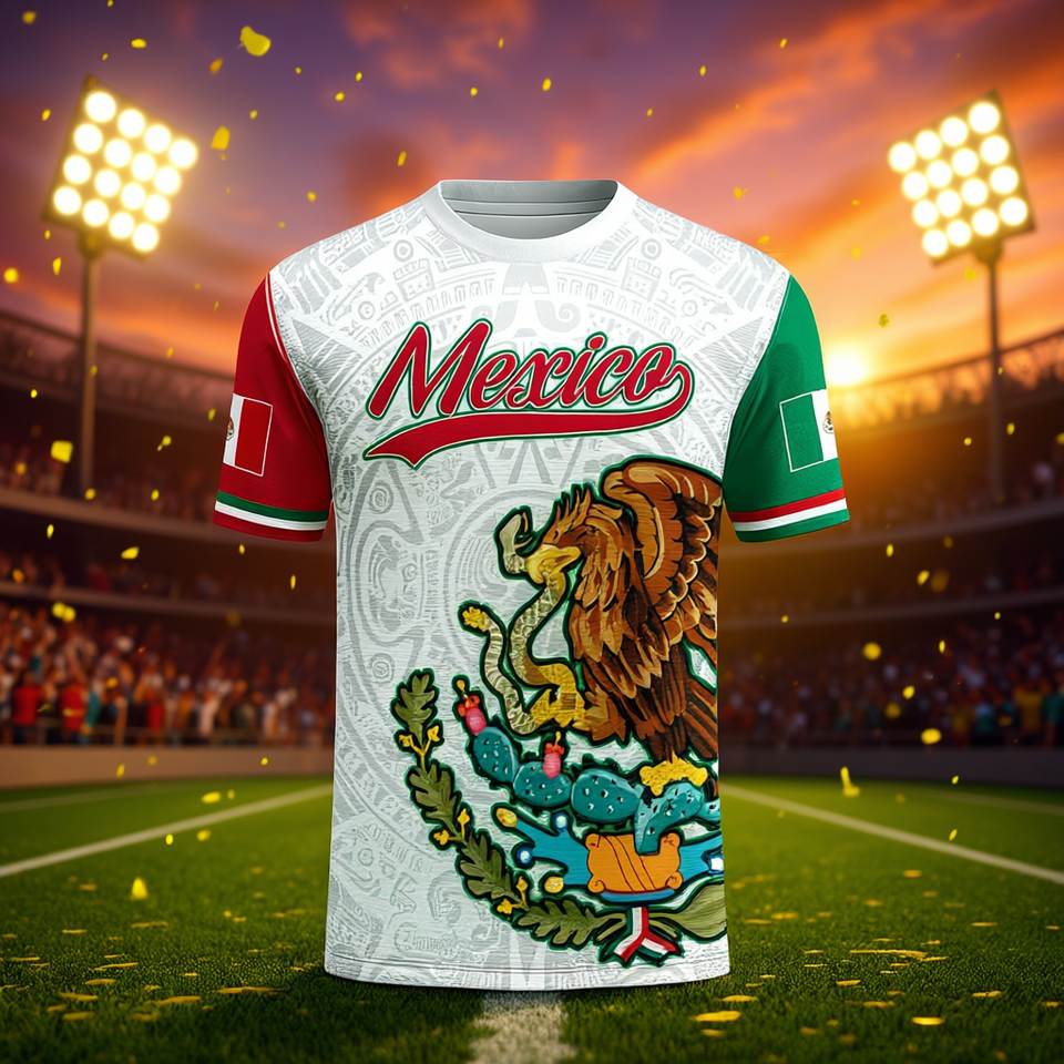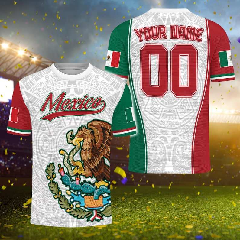 Maglia da Calcio 3D del Messico Personalizzabile con Nome e Numero, Stemma dell'Aquila, Motivo Azteco, Tricolore, Maglia per Tifosi