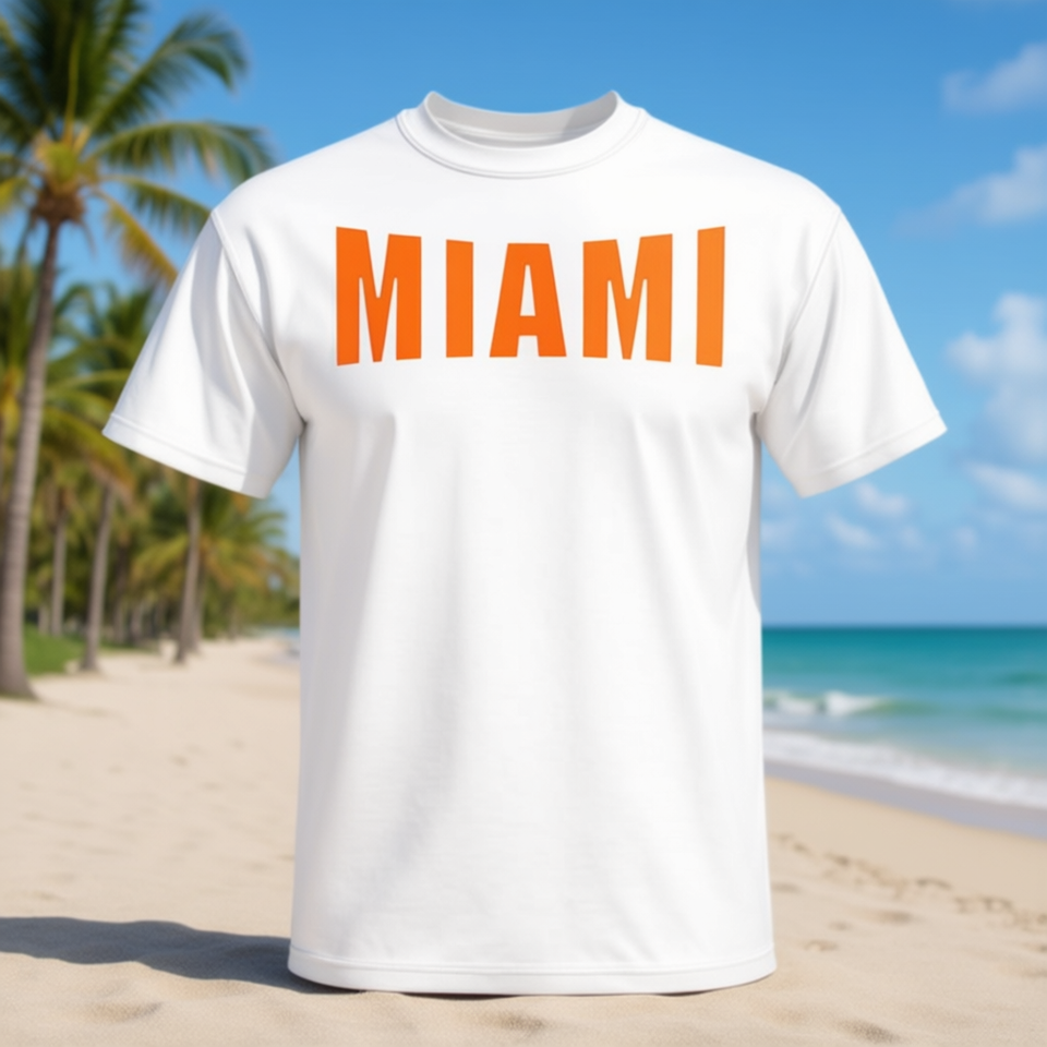 T-shirt classica Miami Throwback con testo bianco e arancione, taglia unisex per adulti