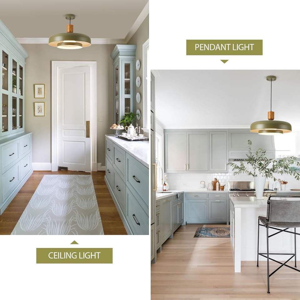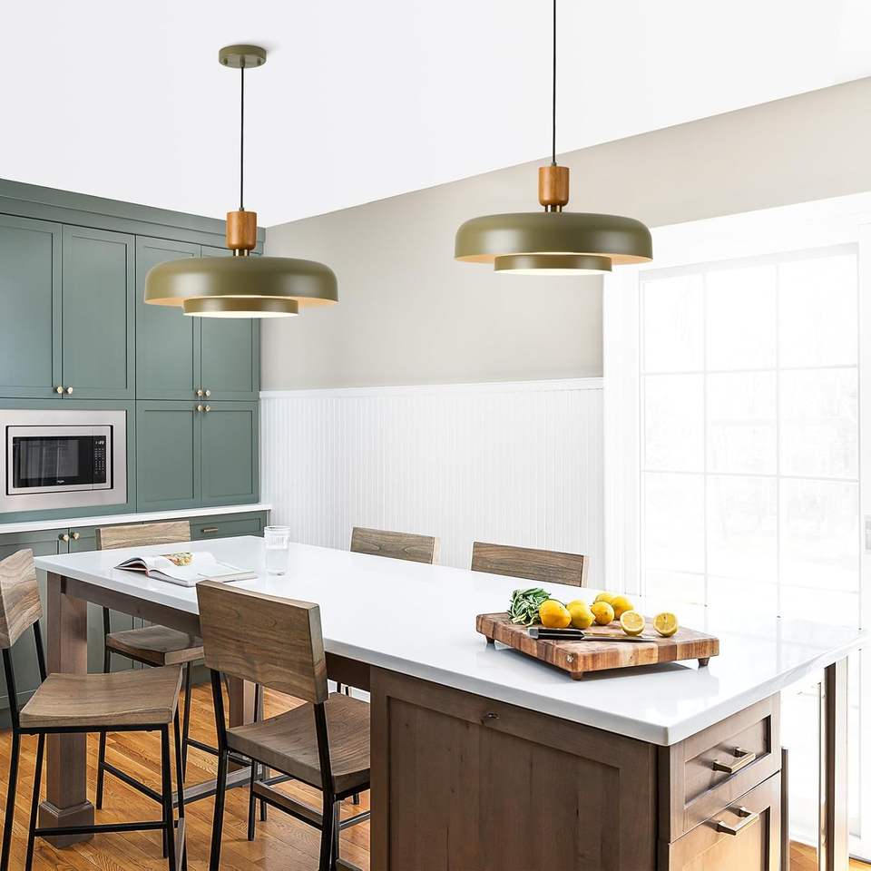 Metà del secolo 19.68 pollici in legno naturale ottone accento lampadario a 2 strati verde intenso grande plafoniera pendente per cucina