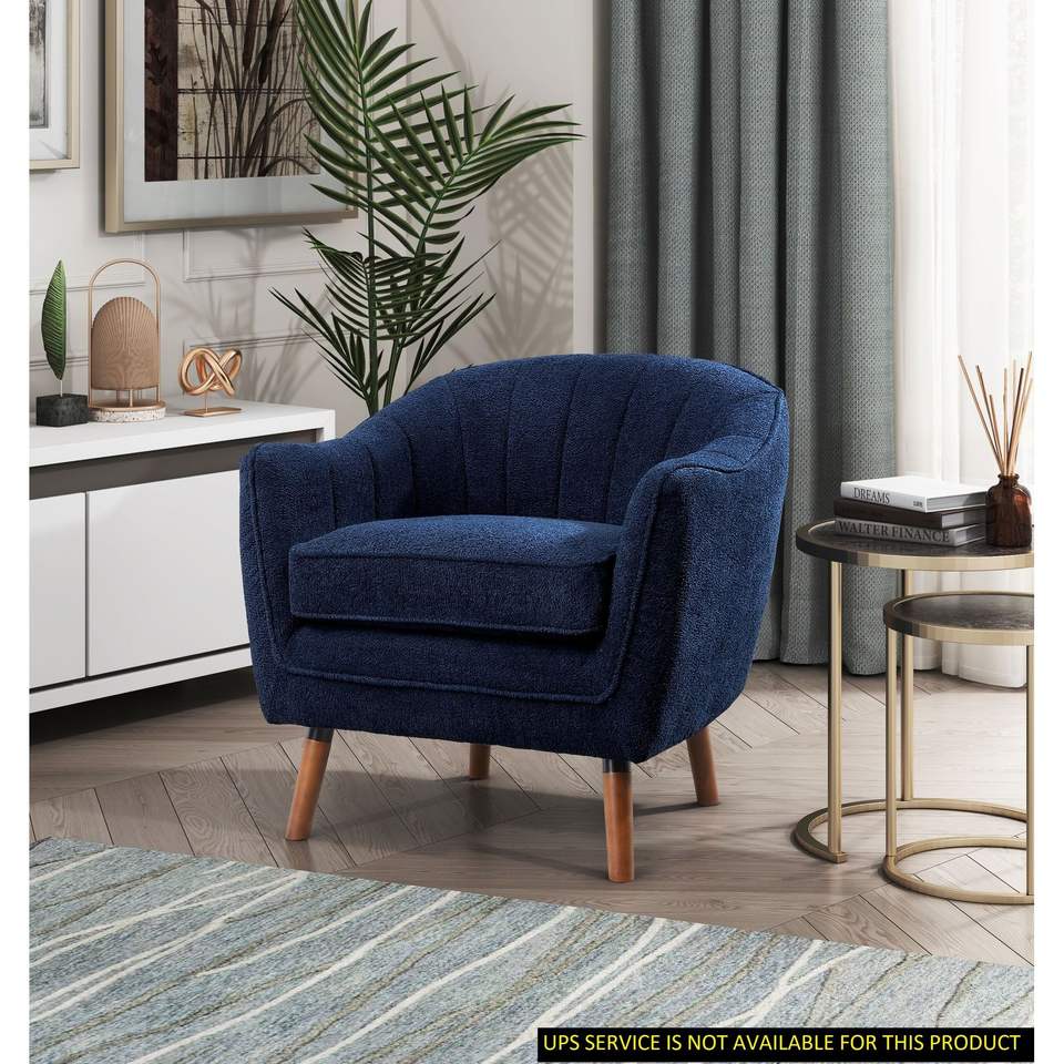 Poltrona Moderna Stile Mid-Century in Tessuto Chenille Blu con Schienale Trapuntato e Gambe in Legno Massello Marrone per Soggiorno