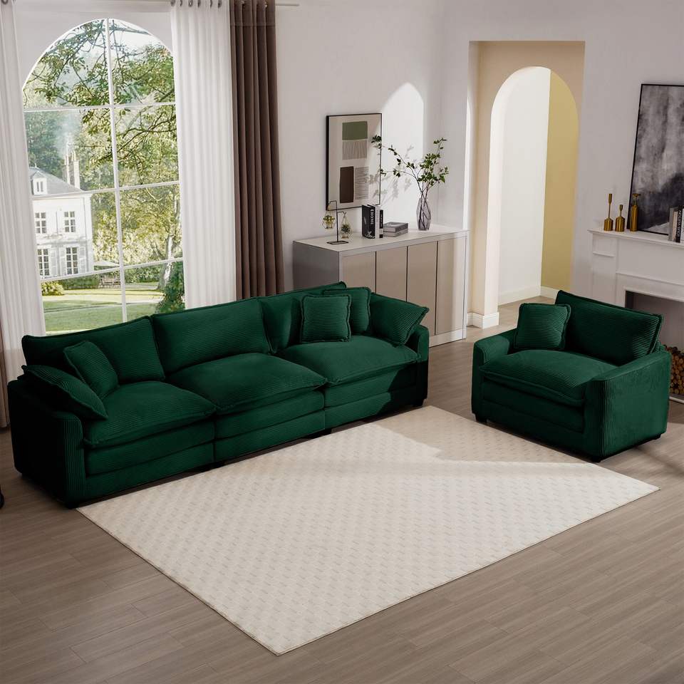 Mid-Century Modern Green Corduroy Fabric Living Room Sectional Set 3-Seater & Single-Seater Sectional with 2 Arm 4 Throw Pillows