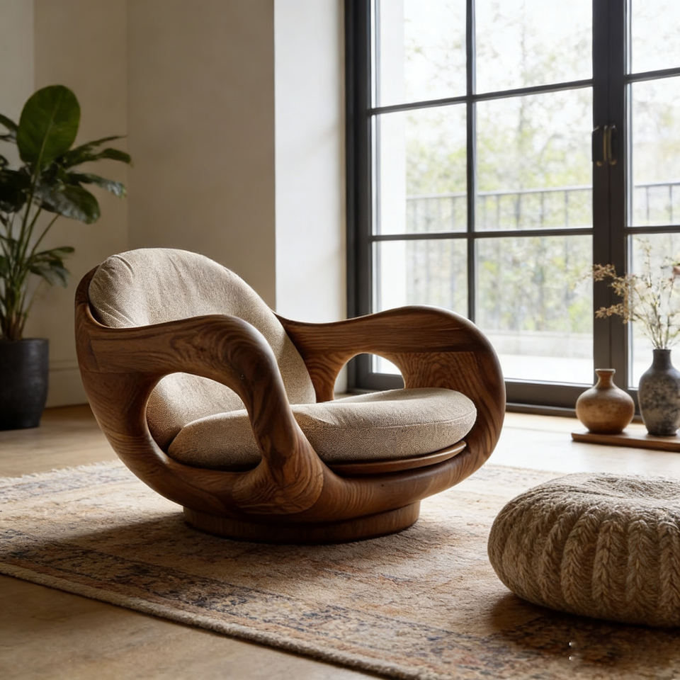 Mid Century Style Solid Wood Curved Leisure Chair Rotatable Base Custom Fabric Color Living Room Showroom Single Sofa Chair