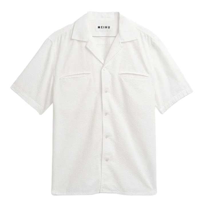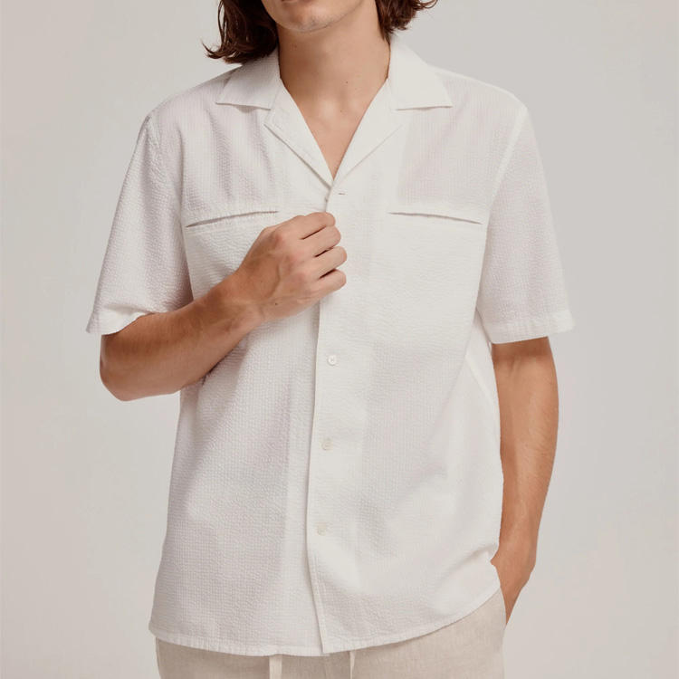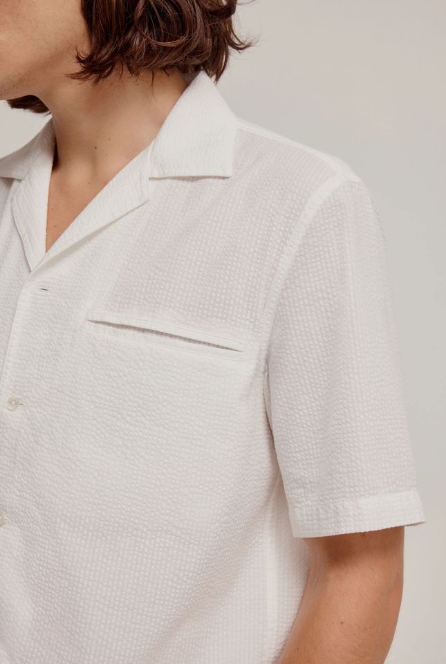 Camicia da cialda in cotone Seersucker a metà peso bianca con bottone e colletto cubano