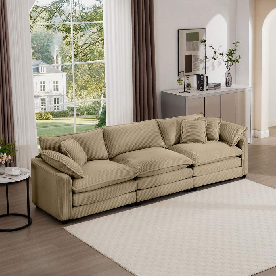 Divano Sezionale a 3 Posti Stile Mid-Century Moderno in Corduroy Tan con 2 Braccioli e 3 Cuscini per Soggiorno